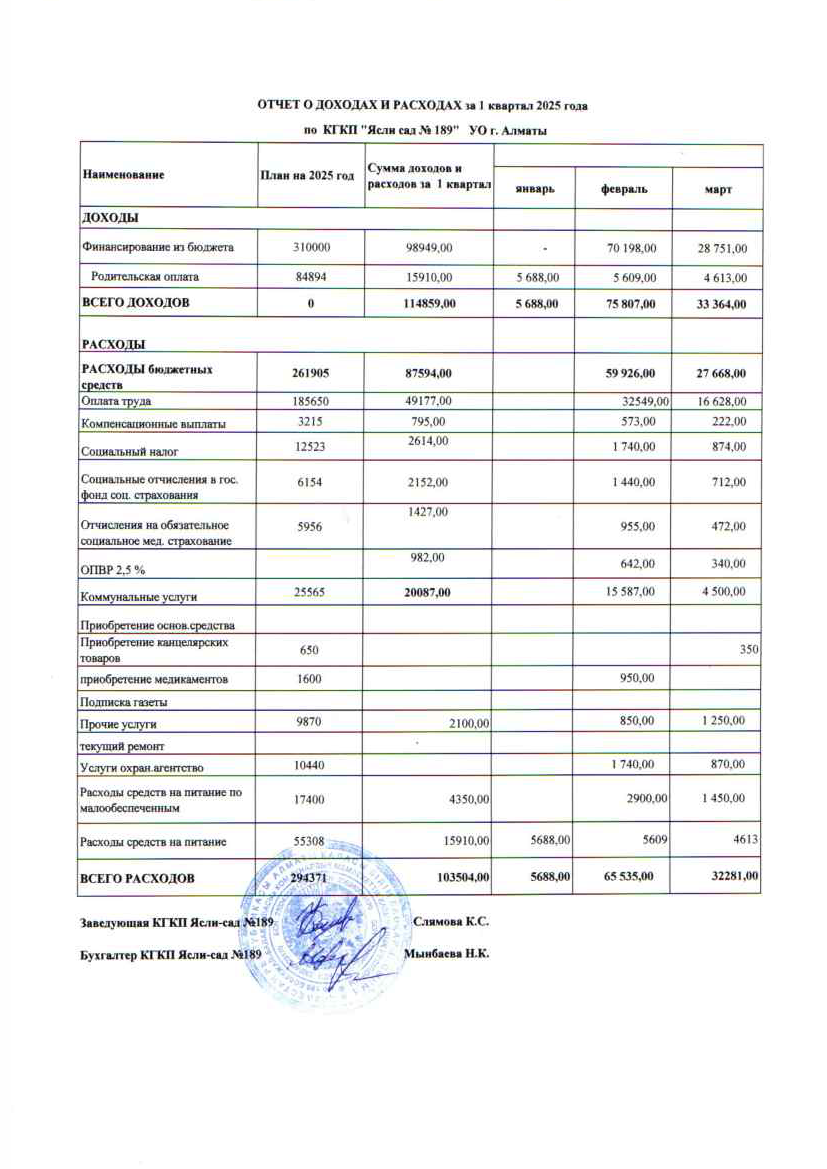 Отчет о доходах и расходах за І квартал 2025 » «№189 бөбекжай -балабақшасы»