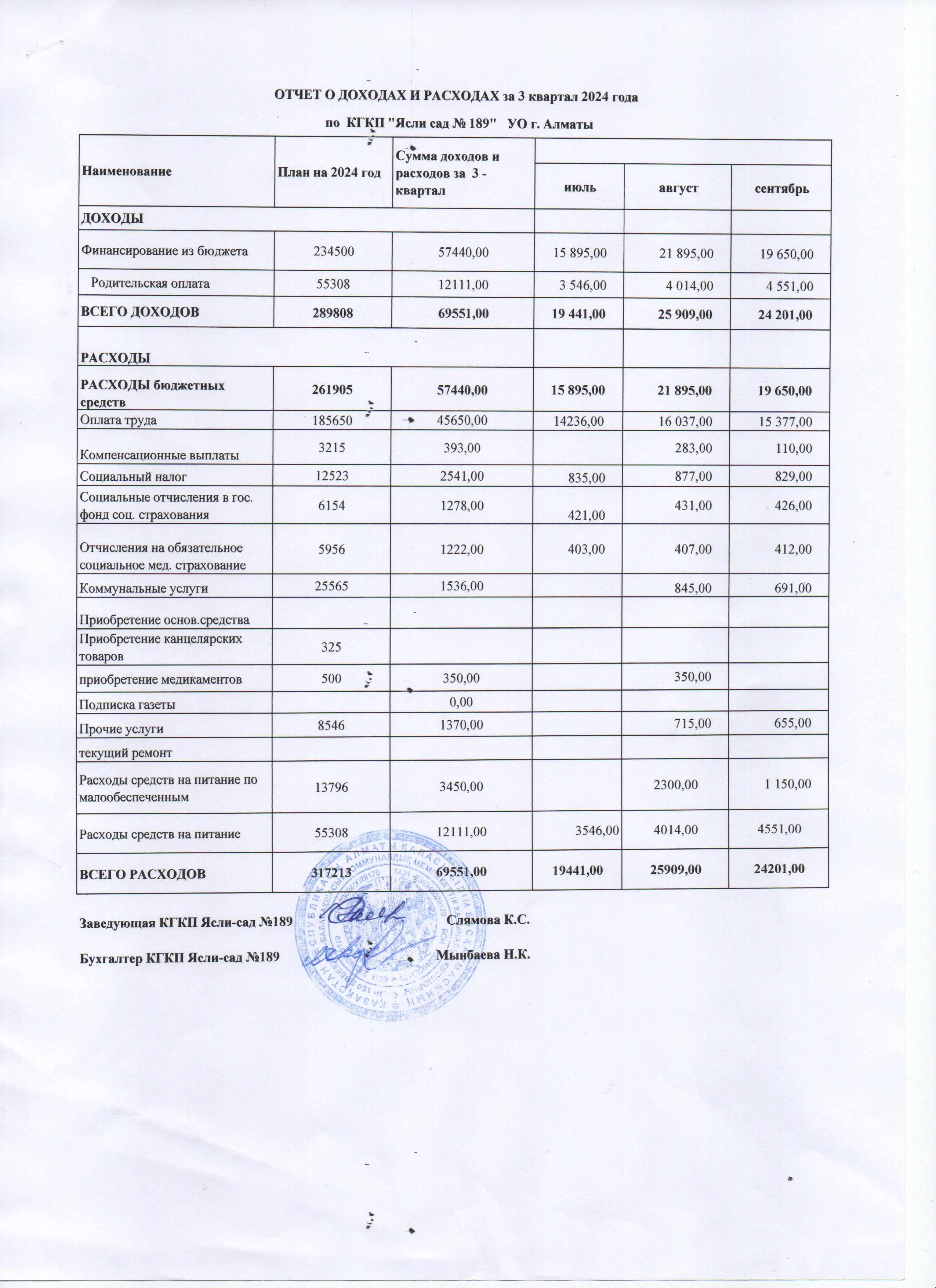 Отчет о доходах и расходах за 3 квартал 2024 » «№189 бөбекжай -балабақшасы»